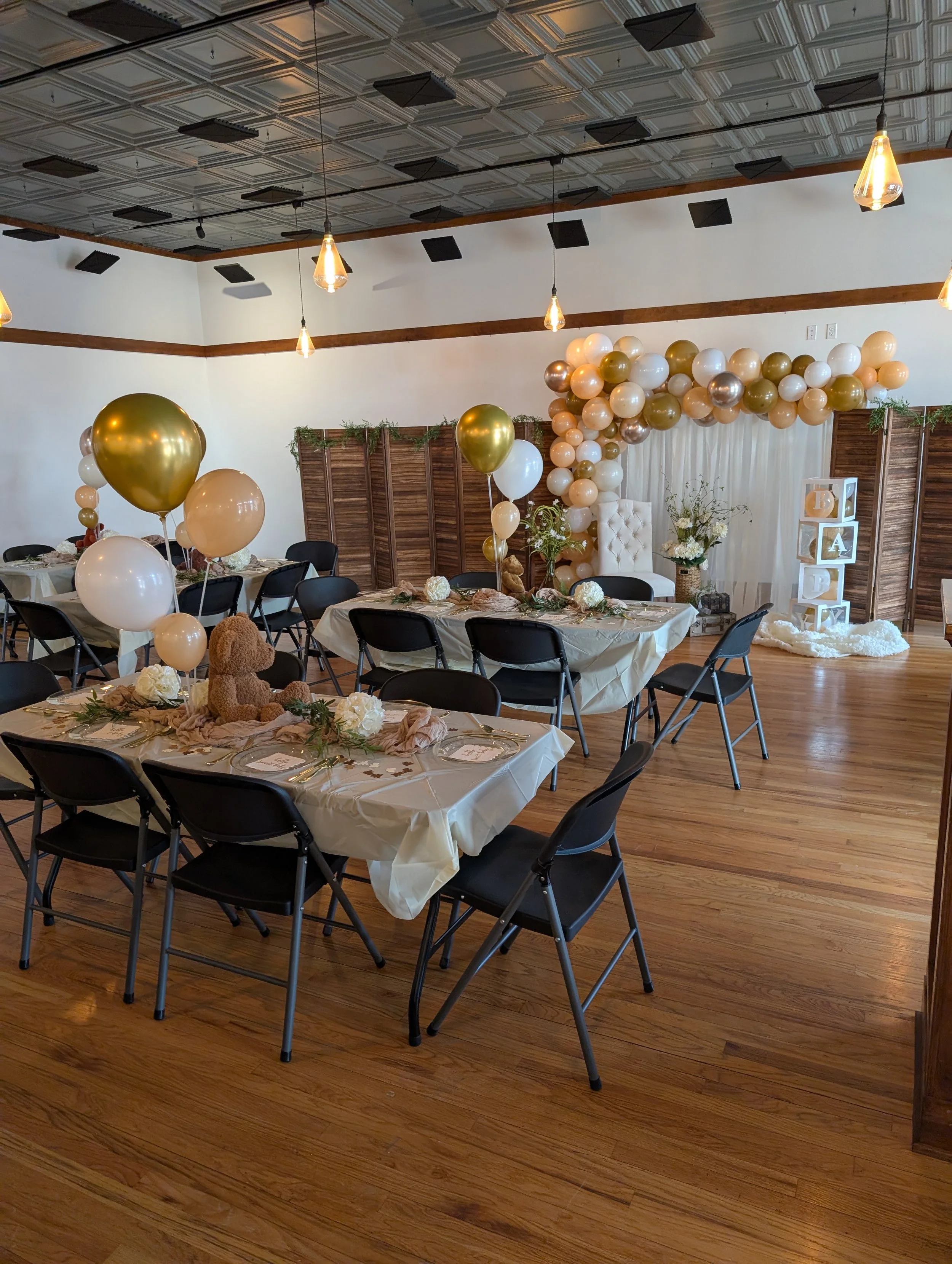Included with space are twenty six foot long BLACK and ten four foot round WHITE tables with enough chairs to fit.